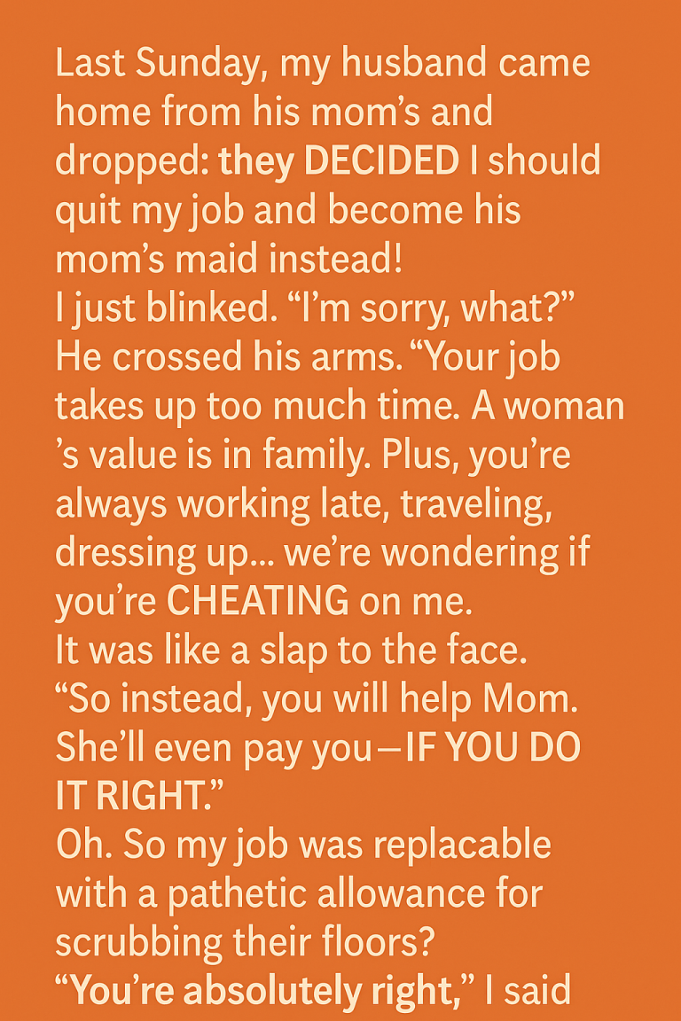 Oh, so my career—my carefully built, decade-long career—could be replaced with a half-hearted allowance to scrub his mother’s floors?