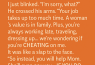 He crossed his arms like some righteous medieval lord issuing a decree. “Your job takes up too much time. A woman’s value is in family. Plus, you’re always working late, traveling, dressing up…” He paused, eyeing me. “We’re wondering if you’re cheating on me.”