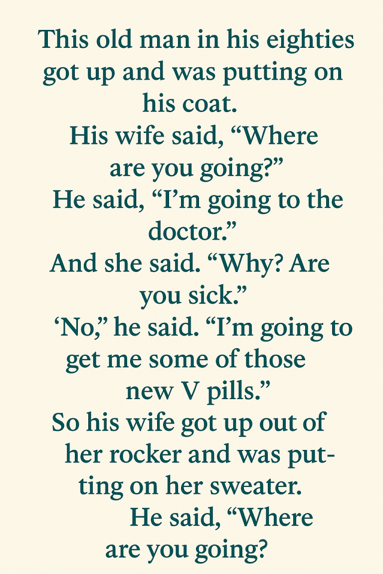 He chuckled, shaking his head. “Nope. I’m going to ask about those new Via4ra pills. You know… figure it’s never too late to try something new.”