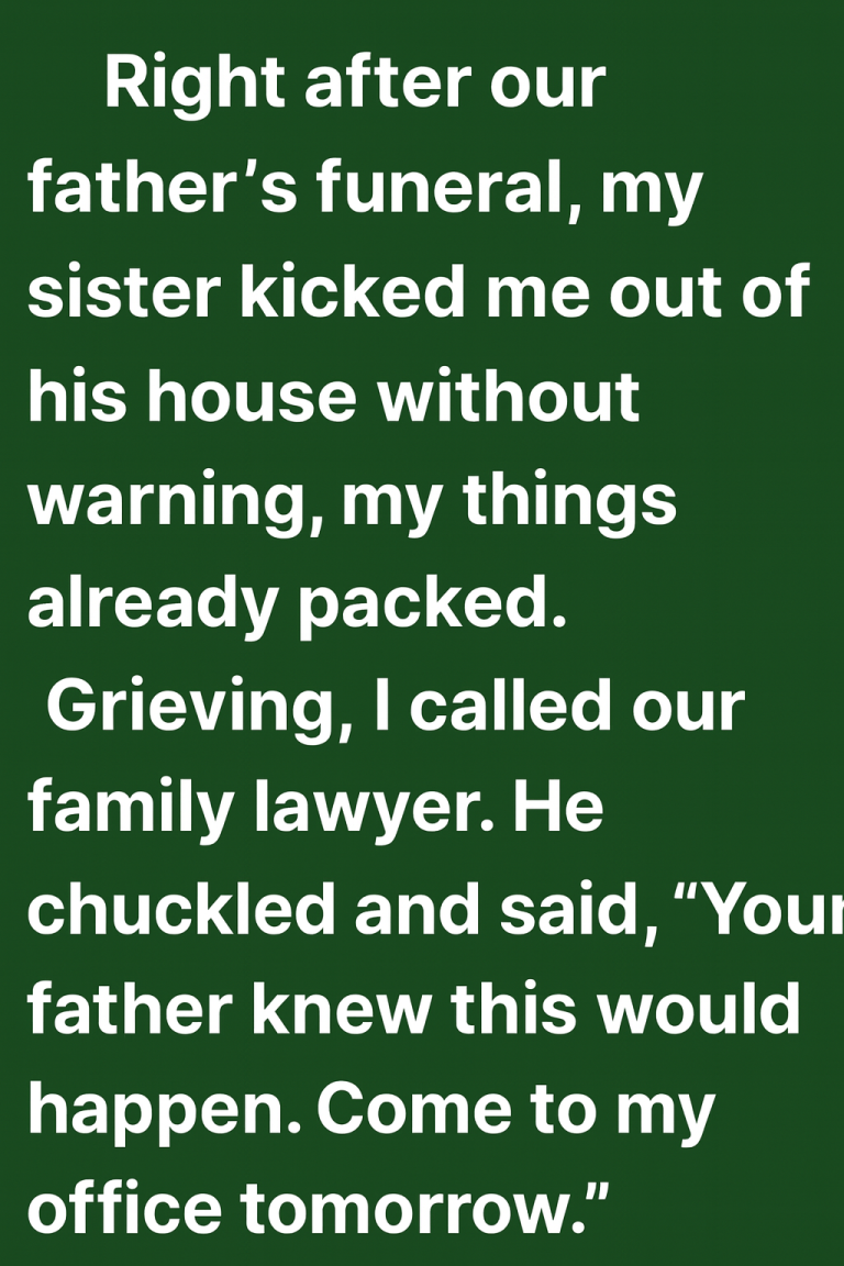 Right after our father’s funeral, my sister kicked me out of his house without warning—my belongings already packed, waiting on the porch like garbage bags after a storm. Grieving and disoriented, I called our family lawyer. He chuckled softly—an unexpected sound in the middle of my unraveling—and said, “Your father knew this would happen. Come to my office tomorrow.”