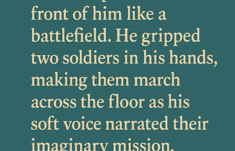 He gripped two soldiers in his hands, making them march across the floor as his soft voice narrated their imaginary mission. One soldier barked orders, the other charged ahead, and Kevin’s mind was alive with a story full of adventure and action.