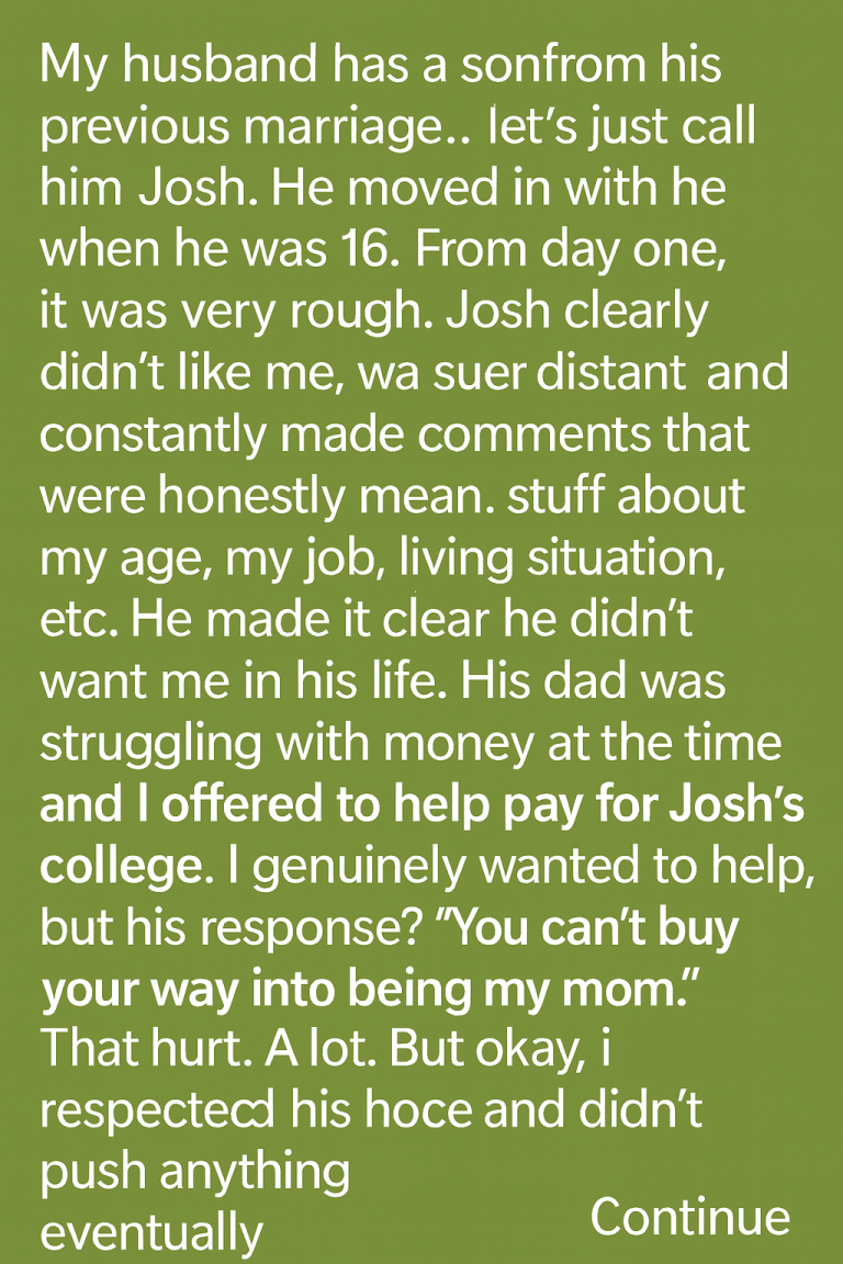 When Josh, my estranged stepson, called after five full years of silence, I barely recognized the voice on the other end. The teenager who once spat, “You can’t buy your way into being my mom,” now sounded polished, mature—and strangely nervous.