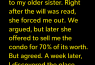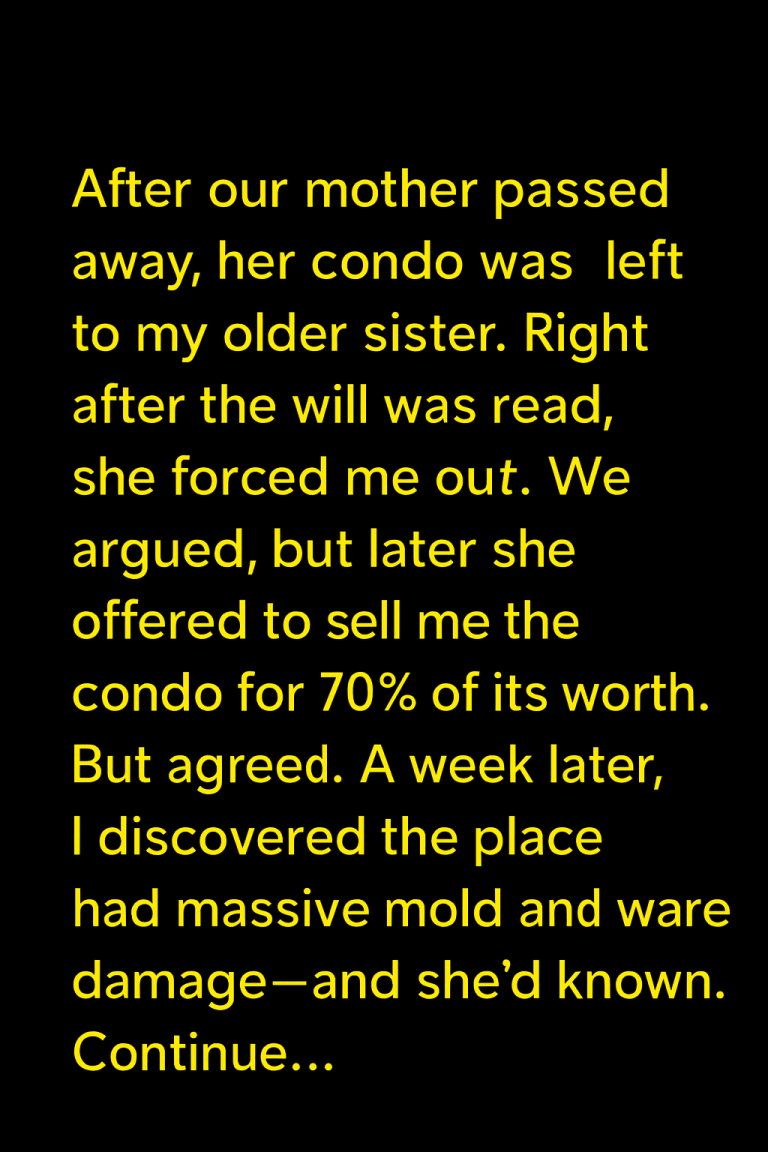 After our mother passed away, her condo was left to my older sister. Right after the will was read, she forced me out. We argued, but later she offered to sell me the condo for 70% of its value. I agreed, thinking maybe we were turning a corner.