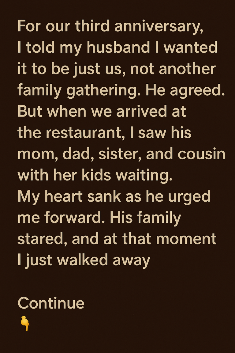 For our third anniversary, I told my husband I wanted it to be just us—not another family gathering, not another evening where I was lost in the background while he played the golden son. He agreed instantly. I believed him. I let myself feel hopeful.