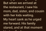 His mom, dad, sister, and cousin—with her kids—were already seated, waving at us like they were welcoming guests to a reunion. My heart sank into my stomach. I stopped walking, but he nudged me forward with a smile, completely oblivious to the storm gathering behind my ribs.