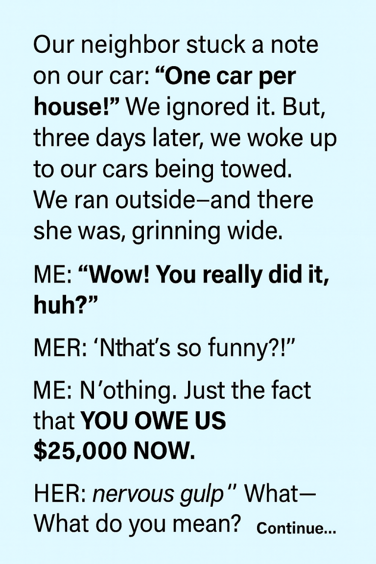 We thanked her anyway. Both our cars were legally parked in our own driveway, perfectly within the rules. We figured she was just one of those self-appointed neighborhood monarchs who lived for HOA guidelines—despite the fact that our block didn’t have an HOA.