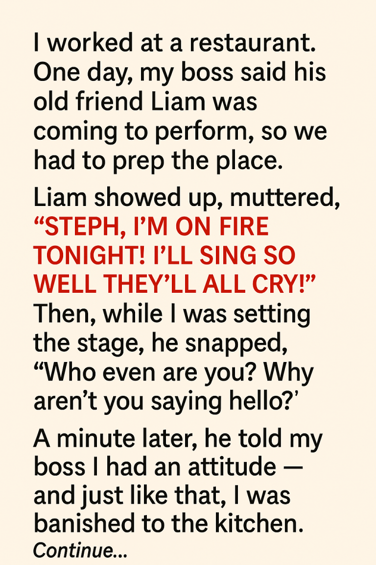“We’ve got a special event tonight!” he announced. “My buddy Liam’s in town. Used to sing with real pros. Treat him like royalty.”