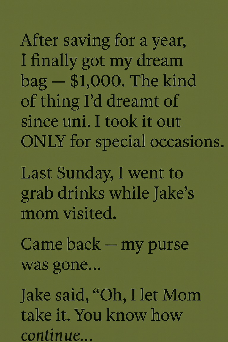 Three months later, Jake’s mother came over for Sunday lunch. She’s not cruel, but warmth from her is as rare as a solar eclipse. While I grabbed drinks from the kitchen, she spotted the purse on the console table where I’d set it after brunch with my best friend.
