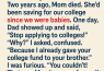 “There’s no point,” he replied, tossing his coat onto a chair. “I already gave your college fund to your brother.”