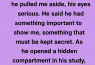 “I have something important to show you,” he said, opening a hidden compartment in the wooden wall of his study.