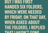 But before I left, I was handed six folders, all “needed by Friday.” When asked about them, I calmly said I hadn’t gone through them and hadn’t even opened them. The look on their faces? Like I’d lobbed a grenade onto the conference table.