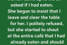 She didn’t take it well. Raising her voice, she announced to the entire café, “He’s already finished eating. He should leave!”