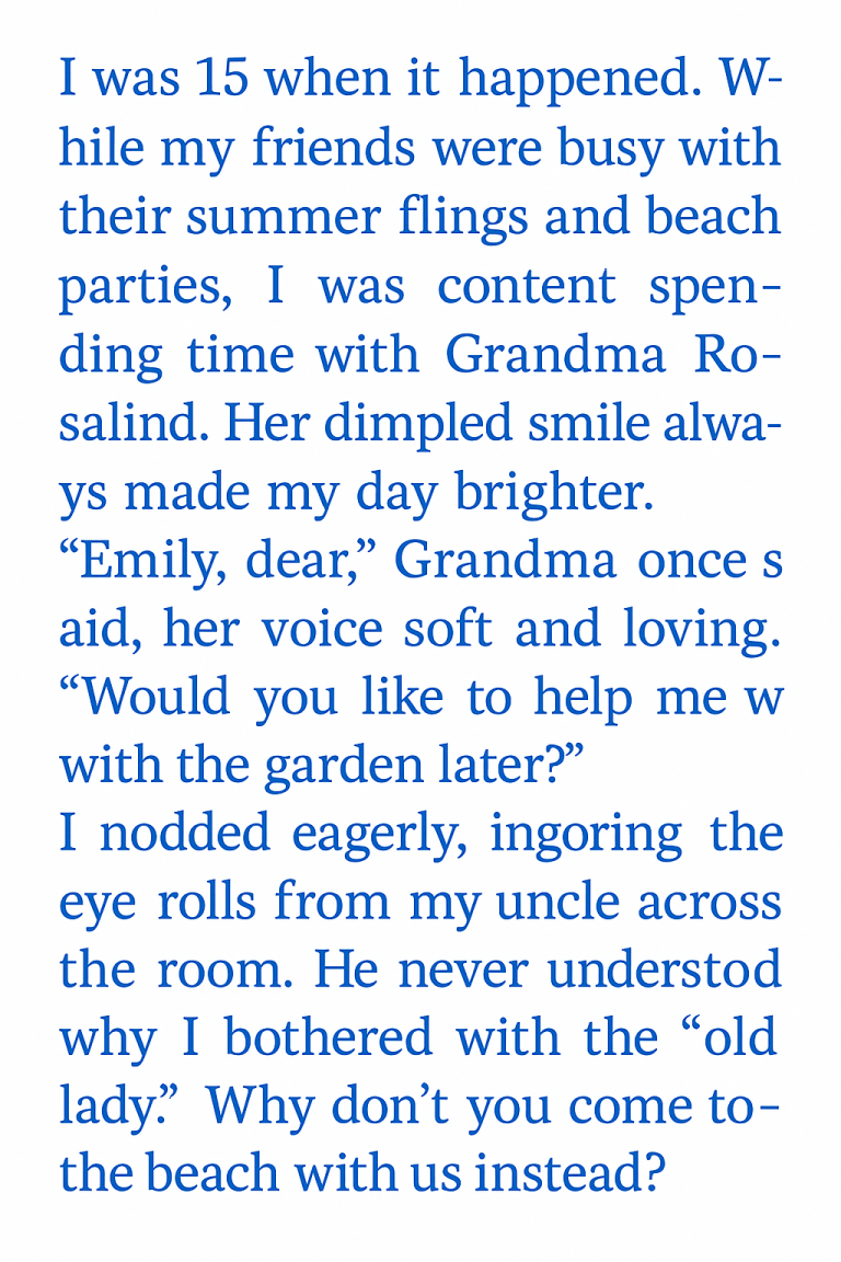 I was 15 when it happened. While my friends were busy with summer flings and beach parties, I was content spending time with Grandma Rosalind. Her dimpled smile always made my day brighter.
