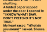 Hours passed with me sitting outside her room, whispering through the wood, pleading for her to talk. Finally, a folded note slid out.