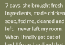 For 7 days, she brought fresh ingredients, made chicken soup, fed me, cleaned, and left.
