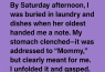 I offered to watch my sister’s kids while she attended a weekend retreat with her husband. By Saturday afternoon, I was buried in laundry and dishes when her oldest handed me a folded note. My stomach clenched—it was addressed to “Mommy,” but the handwriting, shaky and unsure, was clearly meant for me.