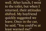 But instead of laughing it off or reassuring me, my boyfriend stayed stone-faced, clearly more concerned about how he looked in front of his parents than how humiliated I felt.