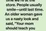 Then came this woman. Late 60s, maybe. Neatly dressed, that stiff kind of hairdo you know takes a lot of hairspray. She scowled, not even slowing her cart, and muttered just loud enough, “Your mom should teach you some manners.”