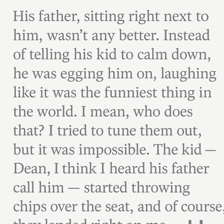 The boy—Dean, I soon learned—swiveled around, smirk plastered on his face. “Calm down, kid! Calm down!” he parroted back, then threw another handful straight at me. His father burst out laughing, actually pulled out his phone, and said, “Wait—say that again! This is hilarious!”