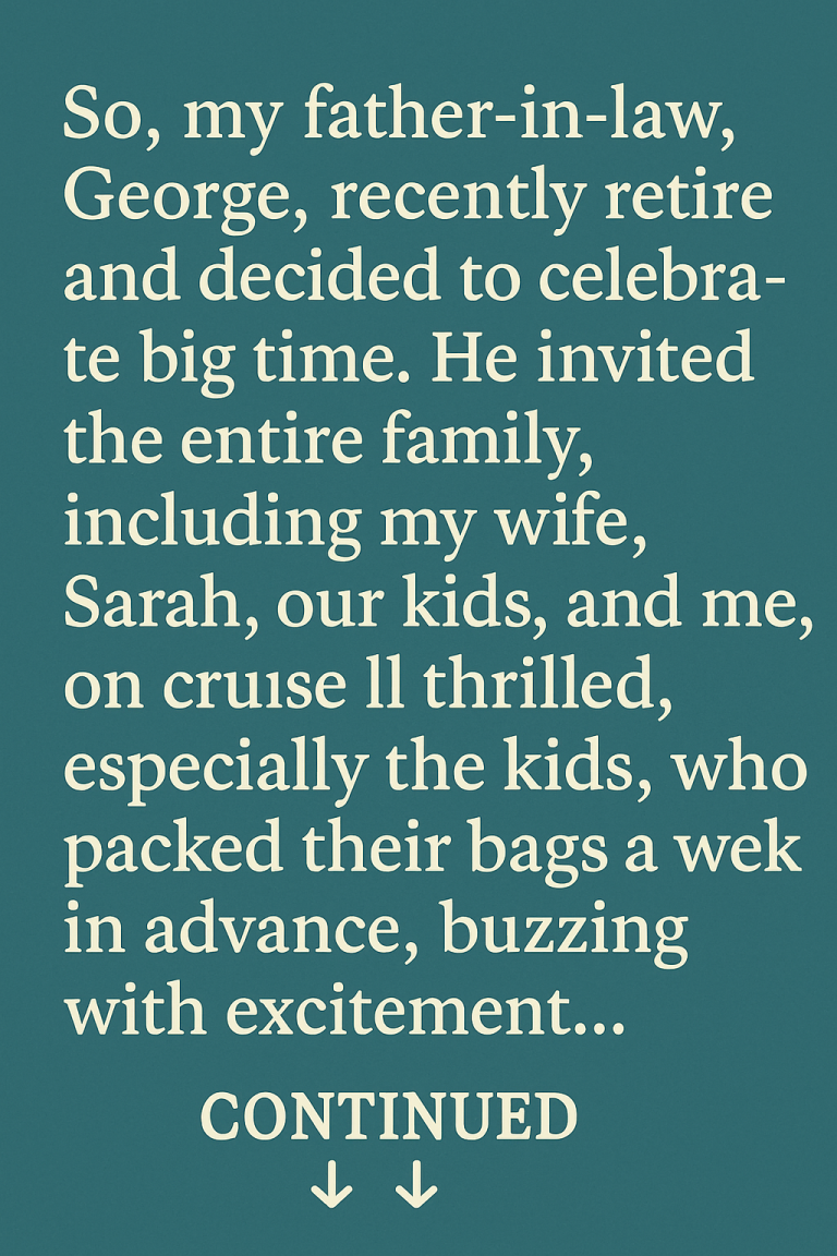 So, my father-in-law, George, recently retired and decided to celebrate big time. He invited the entire family, including my wife, Sarah, our kids, and me, on a cruise. We were all thrilled, especially the kids, who packed their bags a week in advance, buzzing with excitement.