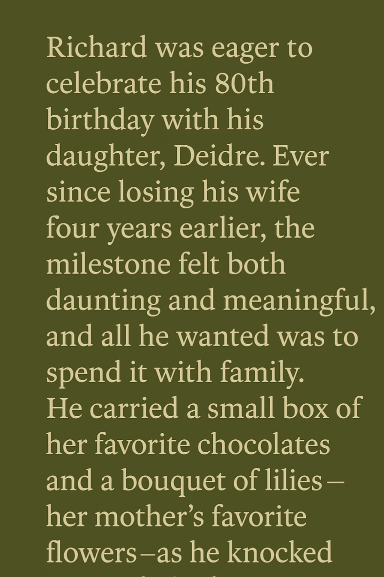 Richard was eager to celebrate his 80th birthday with his daughter, Deidre. Ever since losing his wife four years earlier, the milestone felt both daunting and meaningful, and all he wanted was to spend it with family. He carried a small box of her favorite chocolates and a bouquet of lilies—her mother’s favorite flowers—as he knocked on Deidre’s door.