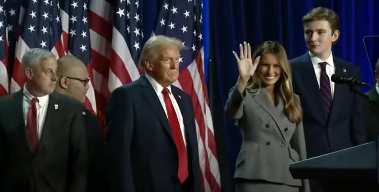 Melania following President Trump to the front of the room, standing in front of the velvet rope line as he shook hands and Orbán grabbed the bouquet from an aide, handing it over while Melania paused for a quick photo…