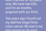 Two years ago I found out my dad has stage three colon cancer. My dad is my only parent as my mom passed away when I was 12. He’s my favorite human and life without him doesn’t seem as colorful. His laugh is contagious and he gives these big bear hugs that seem to make all of your broken pieces feel like they’re perfectly in place again. Whenever I’ve had a hard day he doesn’t poke and prod and just lets me vent and listens. Reddit