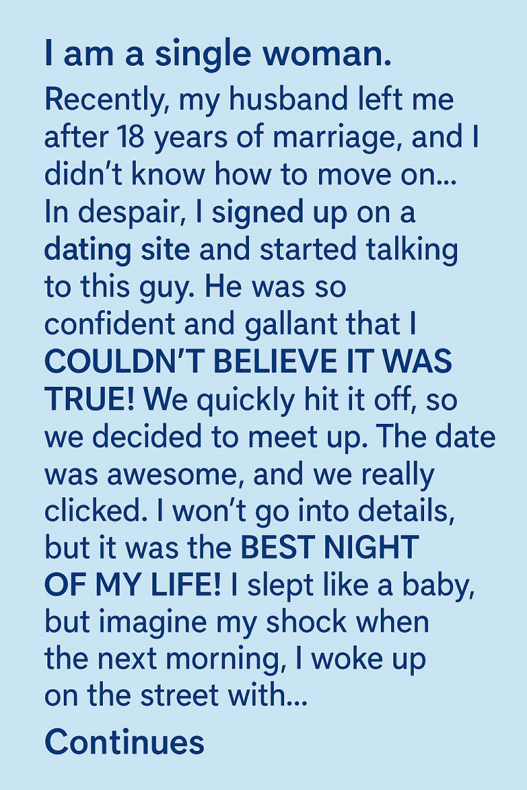 The apartment was modest—bare walls, a faint smell of beer—but I smiled anyway. We talked, drank wine, and laughed until late. For a few hours, it felt almost magical. Maybe love could find me again after all.