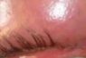 One of the more common skin cancers is basal cell carcinomas, which presents as a raised growth on the eyelid margin or around the eyelid, with pearly/shiny borders, sometimes with a depression/crater in its centre, blood vessels on its surface, and loss of lashes. (Figure 6)