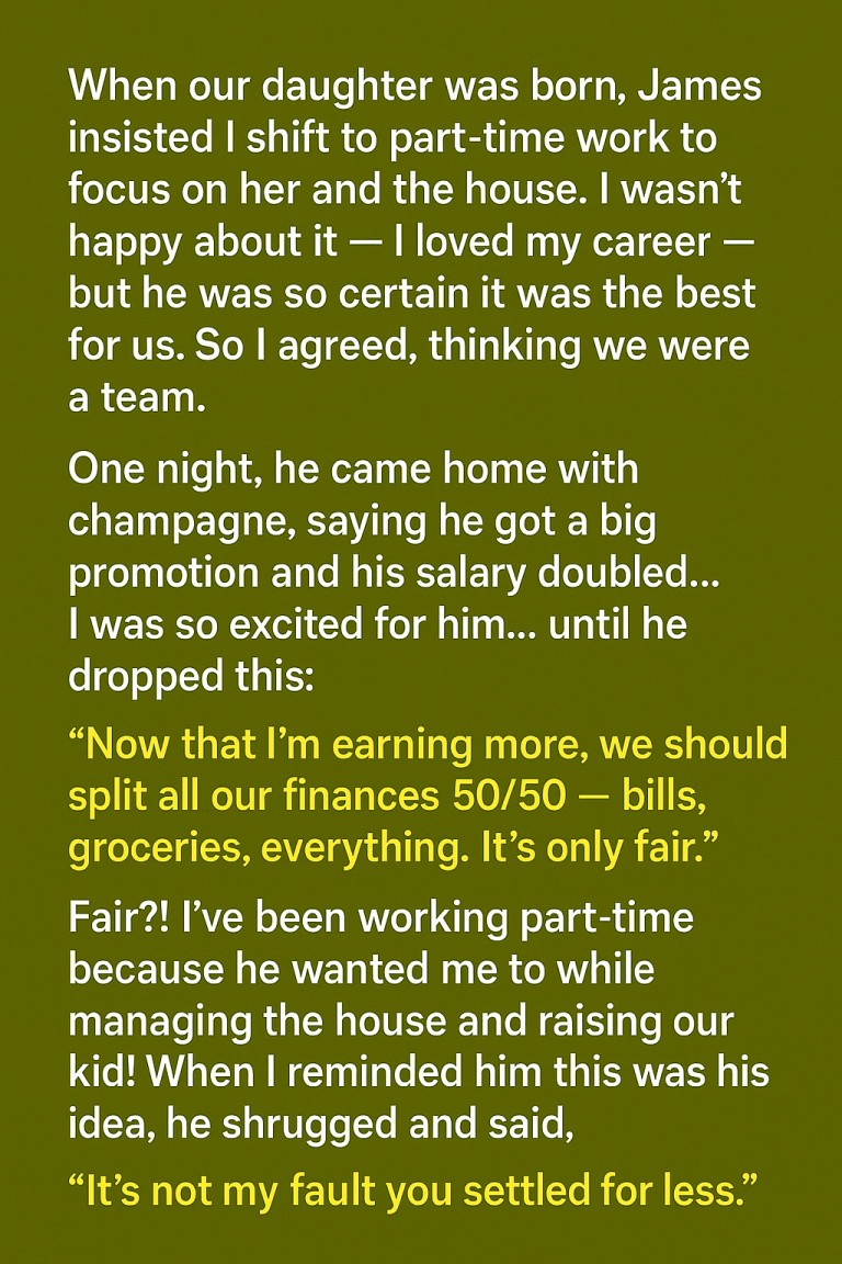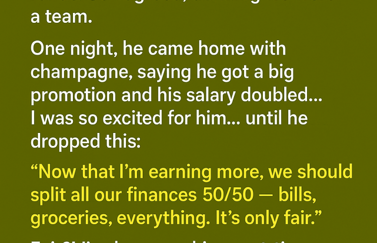 He poured us each a glass, then grew strangely serious. “So… about finances. Since I’m earning more, I think we should formalize things—split everything fifty-fifty. Mortgage, bills, groceries—the works. It’s only fair.”
