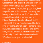 I tried to believe him, but something felt off. Still, we managed to have a nice dinner in town and returned late, falling into an uneasy sleep.