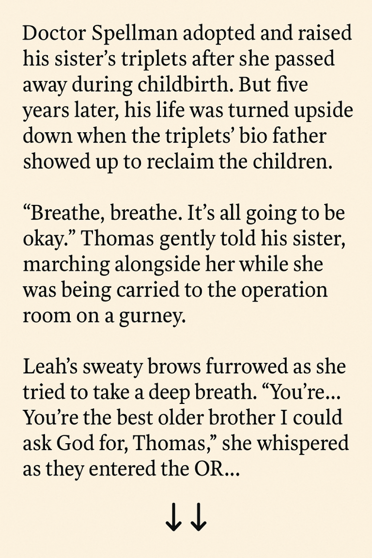 Doctor Thomas Spellman adopted and raised his sister’s triplets after she passed away during childbirth. But five years later, the life he built around those boys was shaken to the core when their biological father showed up to reclaim them.