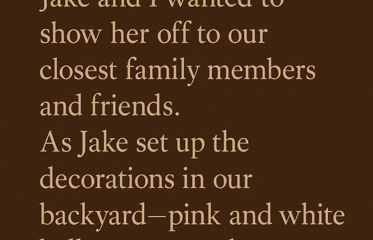 Now, with our baby three weeks old and thriving, the day had finally come. Pink and white balloons filled our backyard, laughter spilled from the caterers, and Jake’s pride was written all over his face as he fussed with the decorations. But even amid the joy, a dark presence lingered: Ruth.