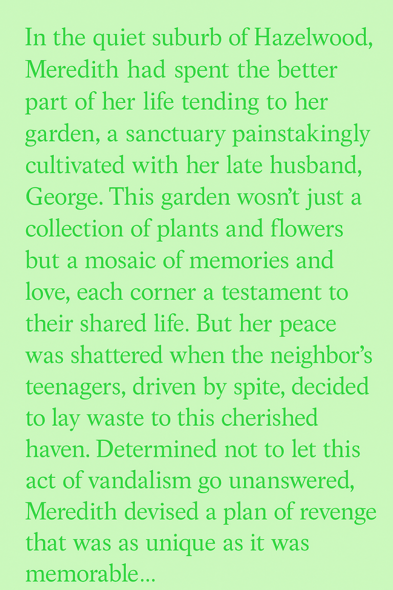 In the quiet suburb of Hazelwood, Meredith had spent the better part of her life tending to her garden, a sanctuary painstakingly cultivated with her late husband, George. This garden wasn’t just a collection of plants and flowers but a mosaic of memories and love, each corner a testament to their shared life. But her peace was shattered one summer night when the neighbor’s teenagers, driven by spite, decided to lay waste to this cherished haven. Determined not to let this act of vandalism go unanswered, Meredith devised a plan of revenge that was as unique as it was unforgettable.