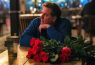 A bouquet of roses in his hand.