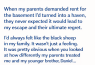 When I was seventeen, we moved into a two-bedroom house. My parents immediately decided Daniel needed his own room. Instead of having us share like normal siblings, they shoved me into the unfinished basement.