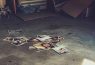 The workbench, and the floor — all covered in photos. Dozens of them.