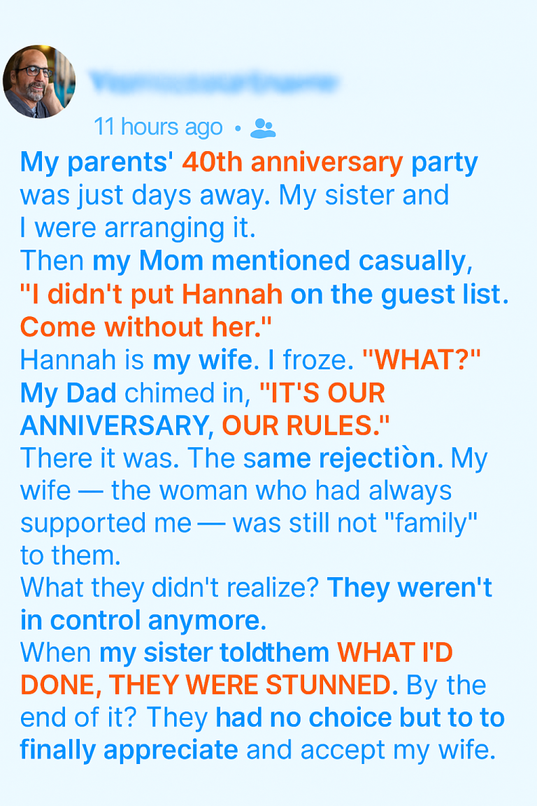 Years passed, and when my sister Claire asked me to help cover some of the expenses for our parents’ 40th anniversary party, I agreed. Maybe, just maybe, this could be the moment they finally accepted Hannah.