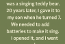 When my son turned seven—the same age I was when my dad bought me that teddy bear—I felt an unexpected pull to pass it on. It seemed right, like a quiet circle closing. The bear had long stopped working, though, so my son and I sat together on the floor to replace the batteries.