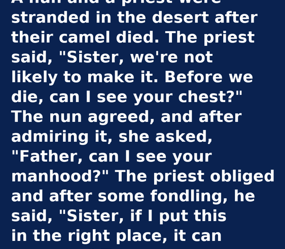 A nun and a priest found themselves stranded in the desert after their camel passed away. The priest, sensing the gravity of the moment, looked at the nun and said, “Sister, it seems we may not survive this.” “Can I see your chest before we die?”