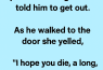 A wife got so mad at her husband that she packed his bags and told him to leave. As he walked to the door, she yelled, “I hope you die a long, slow, painful death!”