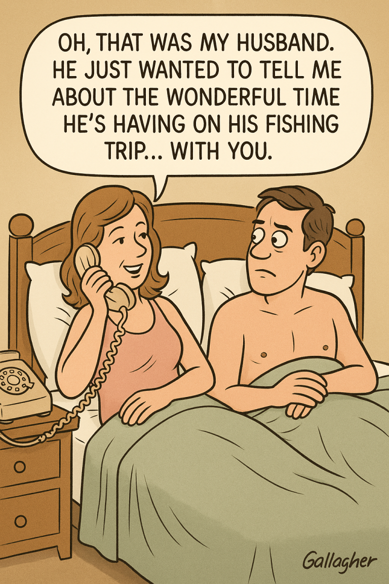 “Oh, that was my husband. He just wanted to tell me about the wonderful time he’s having on his fishing trip… with you.”