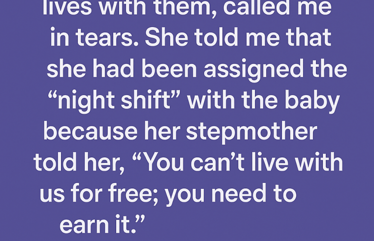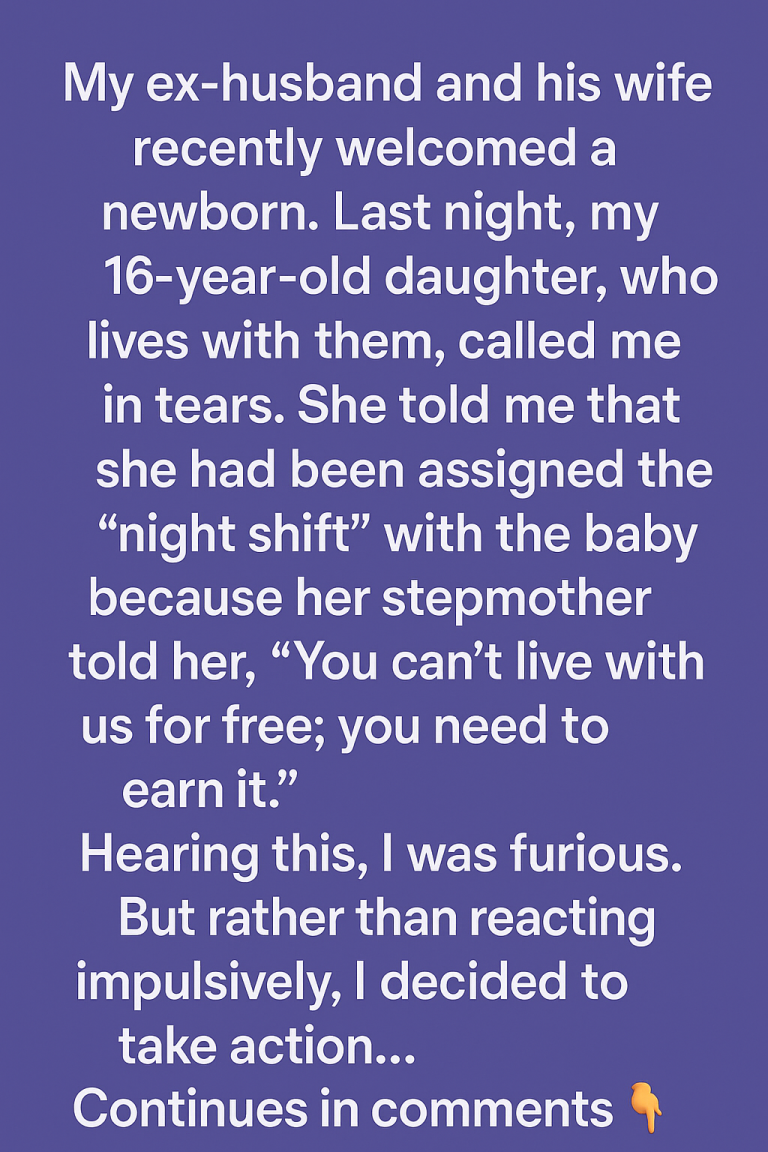 “My ex-husband and his wife recently welcomed a newborn,” the mother shared. “Last night, my 16-year-old daughter, who lives with them, called me in tears. She said she had been assigned the ‘night shift’ with the baby because her stepmother told her, ‘You can’t live with us for free—you need to earn it.’”