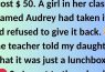 I asked if she went to her teacher, and she said yes, but her teacher told her that it was just a lunchbox, and it shouldn’t matter. Now, Audrey’s name isn’t new to my household; she and other girls always picked on my daughter, and no matter how many times I went to the school about it, nothing was done. To say I was furious was the least.