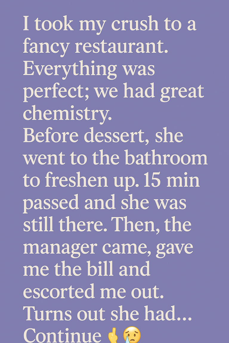 I took my crush to a fancy restaurant. Everything was perfect—we had amazing chemistry, and she laughed at all my jokes. Before dessert, she excused herself to the bathroom to freshen up. Fifteen minutes passed. Then thirty. I started to worry.