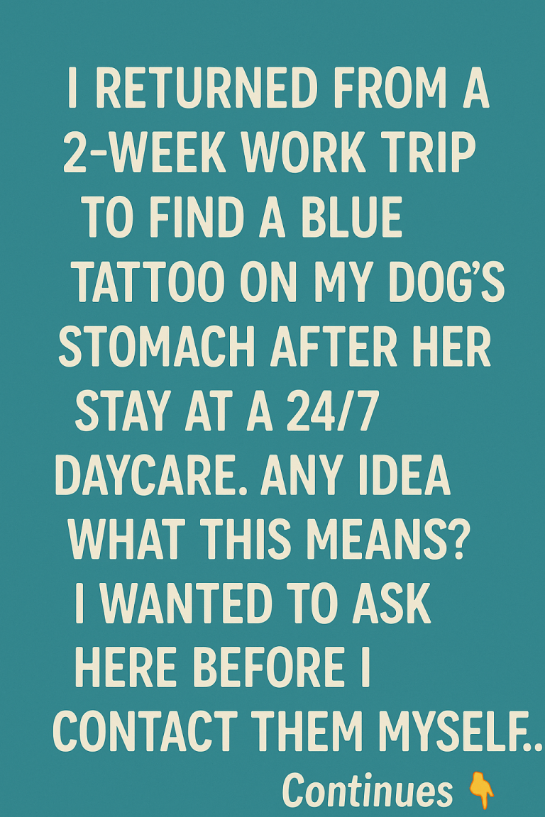 After returning from a two-week work trip, you couldn’t wait to see your dog again. She had stayed at a 24/7 daycare you trusted completely. But as you were cuddling her that evening, something caught your eye — a small blue tattoo on her stomach.