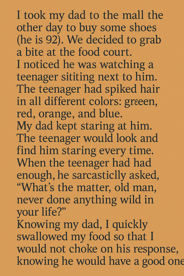 As they sat down, the dad couldn’t help but notice a teenager nearby with spiked hair dyed in every color of the rainbow—green, red, orange, blue. It was quite the sight!