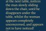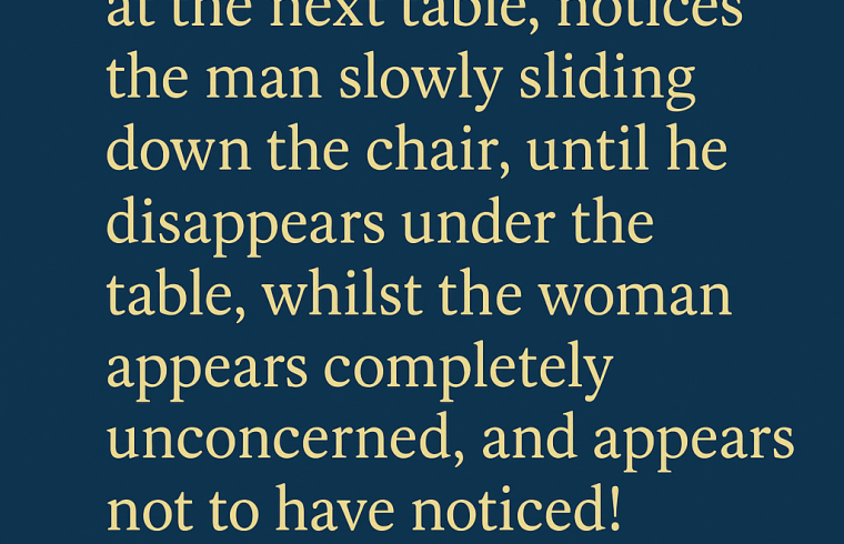 A gentleman and a lady were dining at an elegant restaurant when the waitress noticed something peculiar. The man slowly began sliding down his chair until he completely disappeared beneath the table, while the woman continued eating as though nothing unusual had happened.