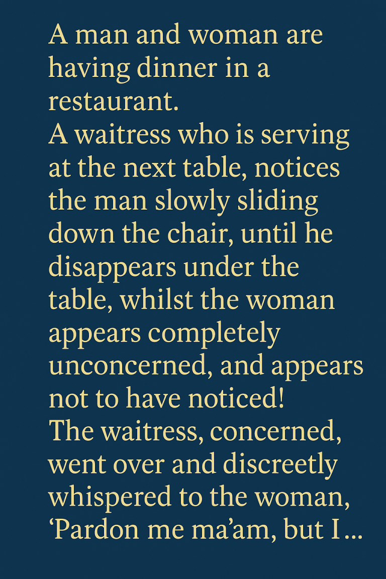 Concerned, the waitress hurried over and whispered discreetly, “Excuse me, ma’am, but I think your husband just slipped under the table.”