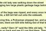 A little old lady was walking down the street dragging two large plastic garbage bags behind her. One of the bags was ripped, and every once in awhile, a $20 bill fell out onto the sidewalk. Noticing this, a Policeman stopped her, and said, “Ma’am, there are $20 bills falling Out of that bag. “Oh, really? Darn it!” said the little old lady. “I’d better go back and see if I can find them. Thanks for telling me officer..” “Well, now, not so fast,” said the cop. “Where did you get all that money?